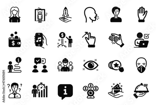 Vector Set of People icons related to Hand, Woman and Cough icons. Income money, Skin care and Hold heart signs. Medical mask, Touchscreen gesture and Business statistics. People voting. Vector