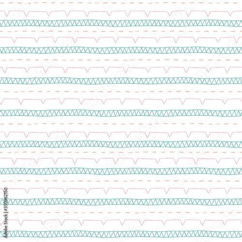 Vector sewing machine stitches seamless pattern. Cute illustration of pastel thread stitched on white background.