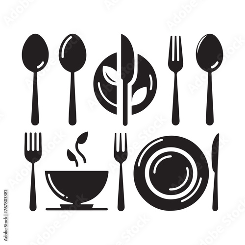Vector Silhouette of Spoon, Fork, and Plates: Dining Utensils in Elegant Table Setting.