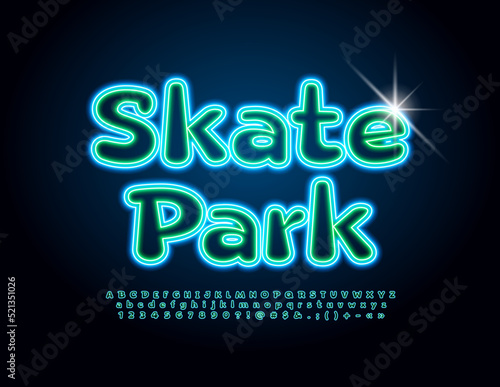 Vector trendy logo Skate Park. Neon playful Font. Glowing Alphabet Letters, Numbers and Symbols set