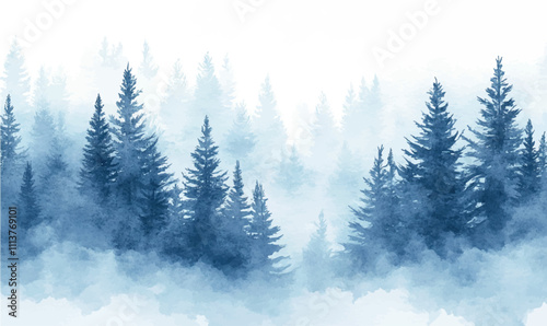 Vector watercolor background winter forest trees, snow, for design