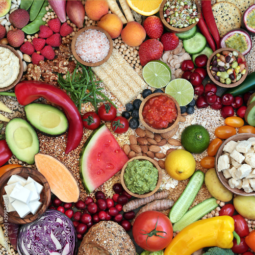 Vegan health food background with super foods high in protein, vitamins, minerals, anthocyanins, antioxidants, fibre, omega 3 and smart carbs. Healthy ethical eating concept. Flat lay.