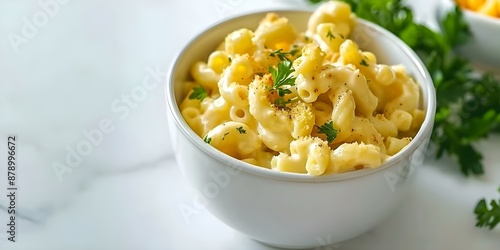 Vegan Mac and Cheese with Cashew Cream Sauce Closeup on White Background. Concept Food Photography, Vegan Recipes, Dairy-Free Dishes, Cashew Cream Creations