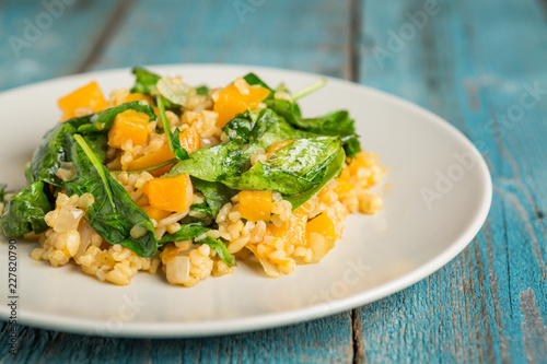 Vegan plate with bulgur and pumpkin.