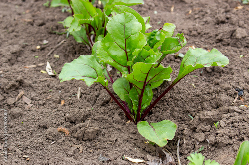 Vegetable bed with table beets, growing beets on the land.