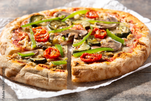 Vegetarian pizza with zucchini, tomato, peppers and mushrooms on wooden table