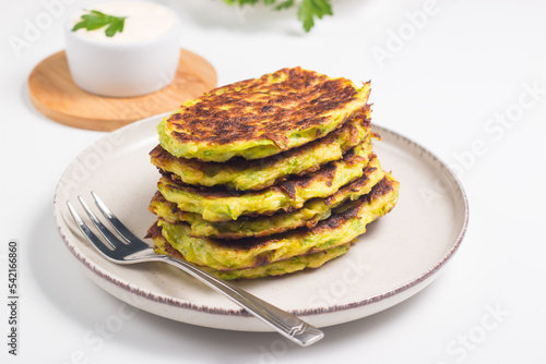 Vegetarian zucchini fritters or courgettes pancakes, served with fresh herbs and sour cream.
