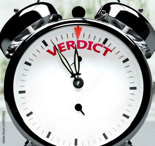 Verdict soon, almost there, in short time - a clock symbolizes a reminder that Verdict is near, will happen and finish quickly in a little while, 3d illustration