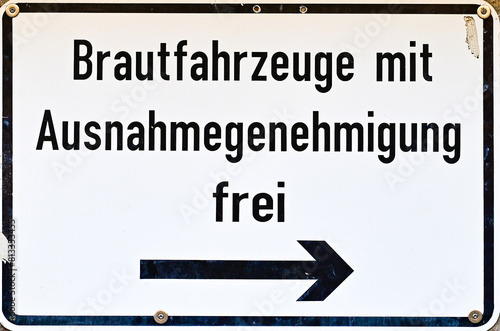 Verkehrsschild mit dem Hinweis "Brautfahrzeuge mit Ausnahmegenehmigung frei" mit einem Pfeil nach rechts in deutscher Sprache, Detail in der Stadt, Schweinfurt, Franken, Bayern, Deutschland