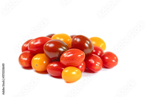 Verschiedene Minitomaten vor weißem Hintergrund
