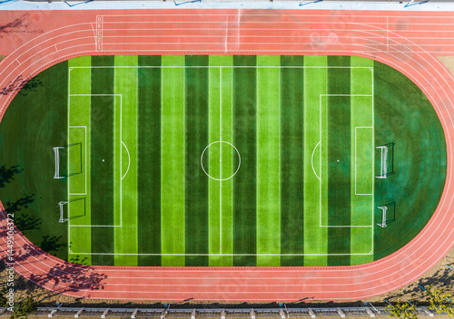 Vertical Aerial View of Soccer Field and Rubber Running Track
