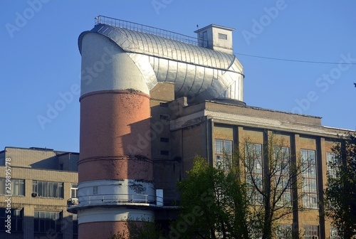 Vertical aerodynamic tube against the blue sky. Beautiful industrial landscape.