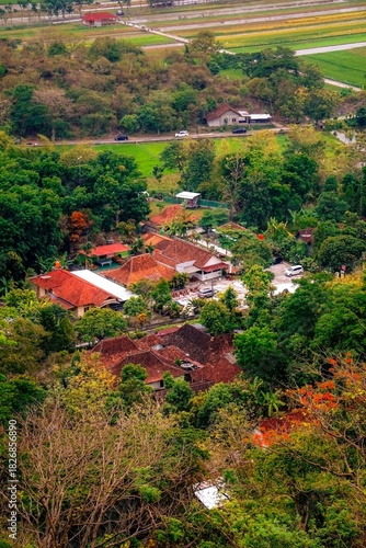 Vertical high-angle shot showcasing traditional housing roofs nestled within a steep, vibrant green forest and surrounding rural landscape.