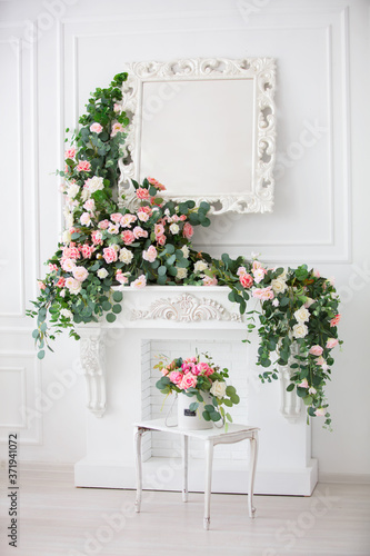 Vertically, the interior of a white room decorated with pink flowers. White fireplace, mirror and flower garlands.