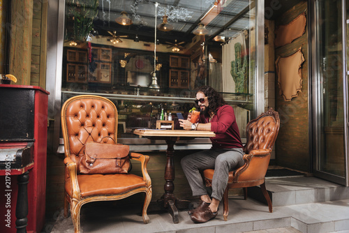 Very delicious. Handsome stylish man using his smartphone while enjoying his alcoholic drink
