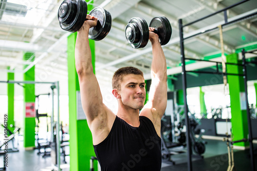 very power athletic man , execute exercise with dumbbells, in gym