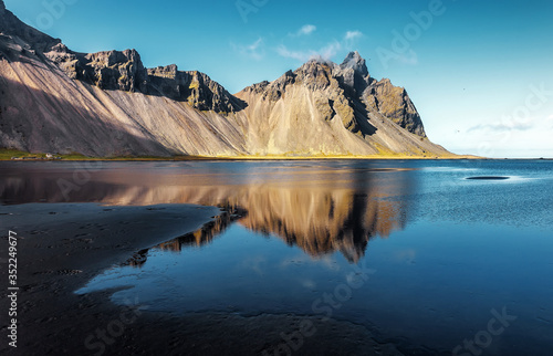 Vestrahorn Stokksnes with ideal reflections. Iceland. Iconic location for landscape photographers