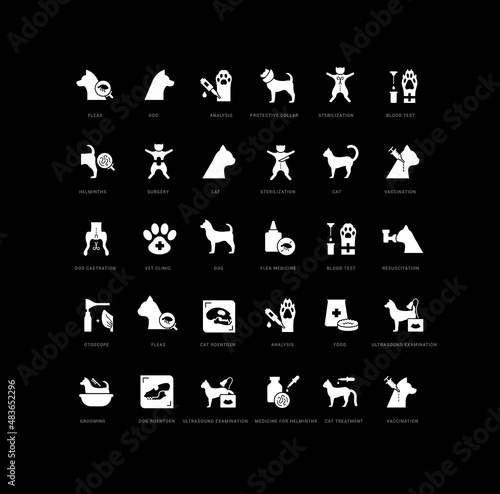 Veterinary Medicine. Collection of perfectly simple monochrome icons for web design, app, and the most modern projects. Universal pack of classical signs for category Medicine.