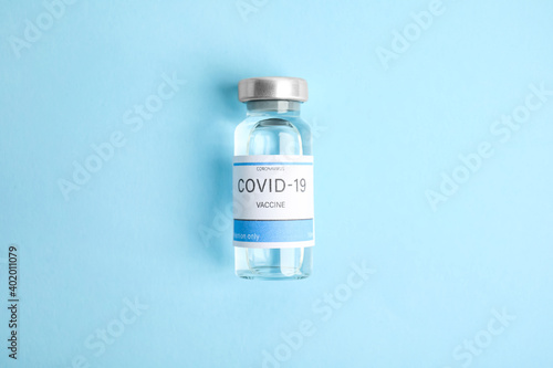 Vial with coronavirus vaccine on light blue background, top view