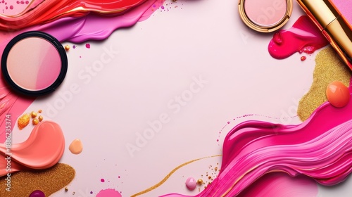 Vibrant abstract background inspired by the colors of makeup products: A dynamic design featuring swirling patterns and bold splashes of pinks, reds, and golds, evoking the vibrancy of makeup