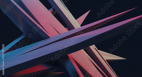 Vibrant abstract composition with intersecting geometric shapes in shades of pink, blue, and purple.
