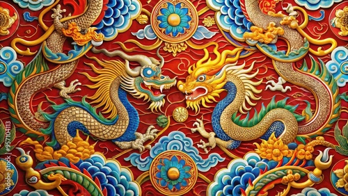 Vibrant abstract design featuring intricate Chinese-inspired motifs, swirling dragons, and geometric patterns in bold red, gold, and blue hues, evoking ancient cultural heritage.