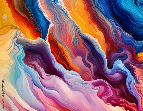 Vibrant abstract painting with swirling patterns in blue, yellow, red, and orange hues, resembling fluid motion and dynamic energy, Generative AI.