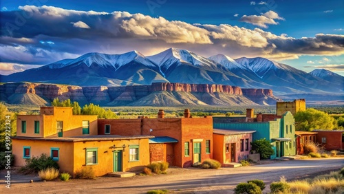 Vibrant adobe buildings stand against a backdrop of rugged blue mountains in a quaint Pueblo West, Colorado town, exuding Old West charm and rustic appeal.