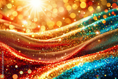 Vibrant and colorful abstract scene with flowing lines, possibly representing motion or energy, set against a backdrop of sparkling stars and a bright sun.
