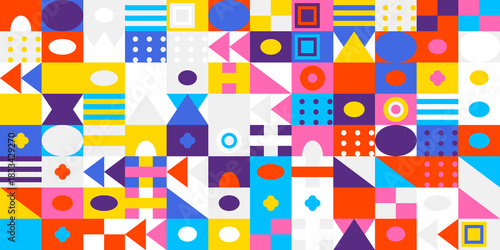 Vibrant and colorful geometric mosaic pattern with an array of abstract shapes and modern design elements