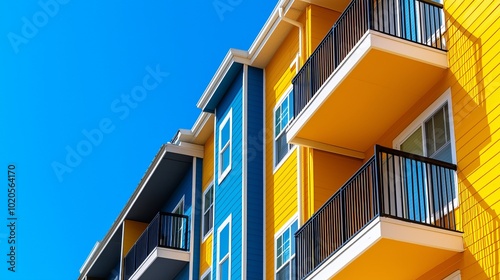 Vibrant apartment building featuring colorful balconies and clear blue sky, perfect for showcasing modern architecture.