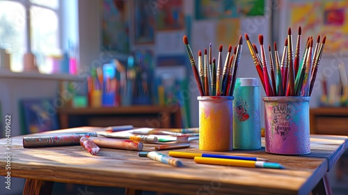 Vibrant Art Studio with Paintbrushes and Supplies on Wooden Table in Sunlit Creative Workspace