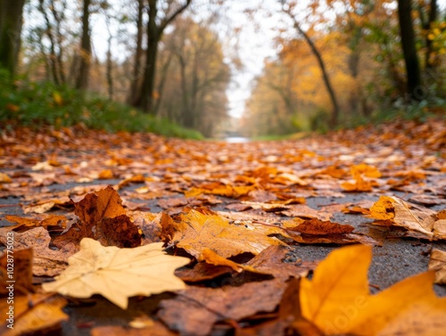 Vibrant Autumn Path with Orange Leaves in Riverside