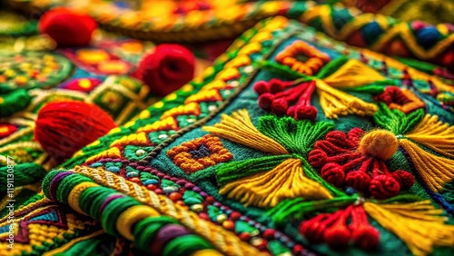 Vibrant Balochi Embroidery: Green, Yellow, Red Threads on Textile