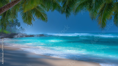Vibrant beach scene with palm trees and turquoise water