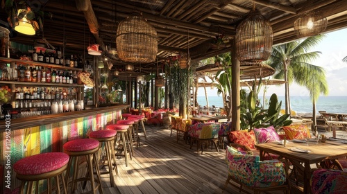 Vibrant Beachside Cafe Interior with Tropical Decor and Atmosphere