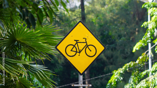 Vibrant bicycle lane sign amid lush tropical foliage, road safety emphasis