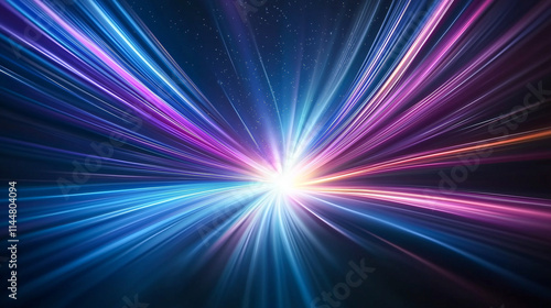 Vibrant blue and purple light rays converge towards bright center, creating dynamic and abstract visual effect. This evokes sense of movement and energy