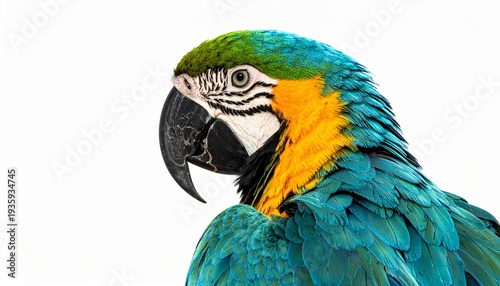 Vibrant blue and yellow macaw parrot close-up portrait with detailed feathers on white background