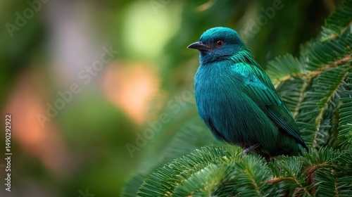 Vibrant blue bird perched on a lush green branch.