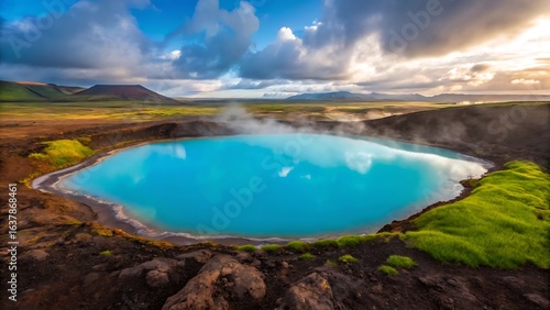 Vibrant blue geothermal pool steaming under dramatic sky