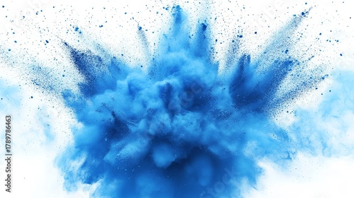 Vibrant blue powder explosion against a clean white backdrop, creating a dynamic and captivating visual