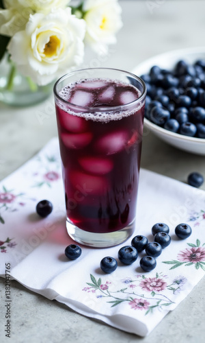 Vibrant Blueberry Juice - White Linen Napkin, Floral Embroidery