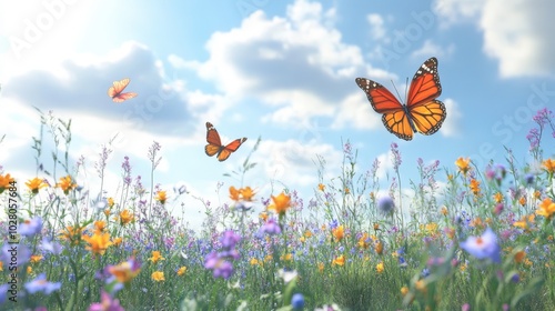 Vibrant butterflies flutter over a colorful spring meadow.