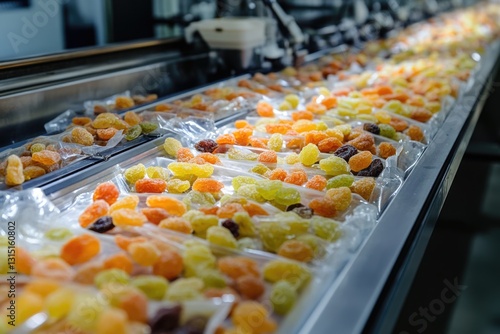 Vibrant Candied Fruit on Conveyor Belt: Delicious Treats Production Line