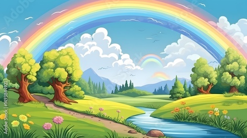 Vibrant Cartoon Vector Illustration of a Beautiful Landscape with Rainbow