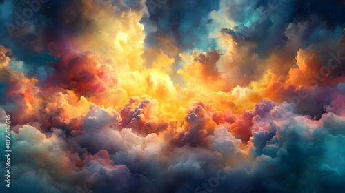 Vibrant Celestial Cloudscape: A Digital Painting of Imaginary Colorful Clouds Illuminated from Within, Creating a Dreamlike, Abstract Background