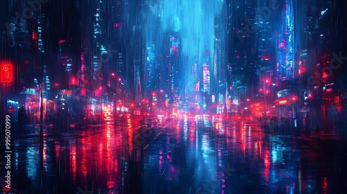 Vibrant cityscape at night with neon lights reflecting on wet pavement.