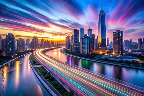 Vibrant Cityscape at Sunset with Light Trails and River