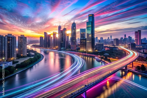 Vibrant Cityscape at Sunset with Light Trails on Bridge